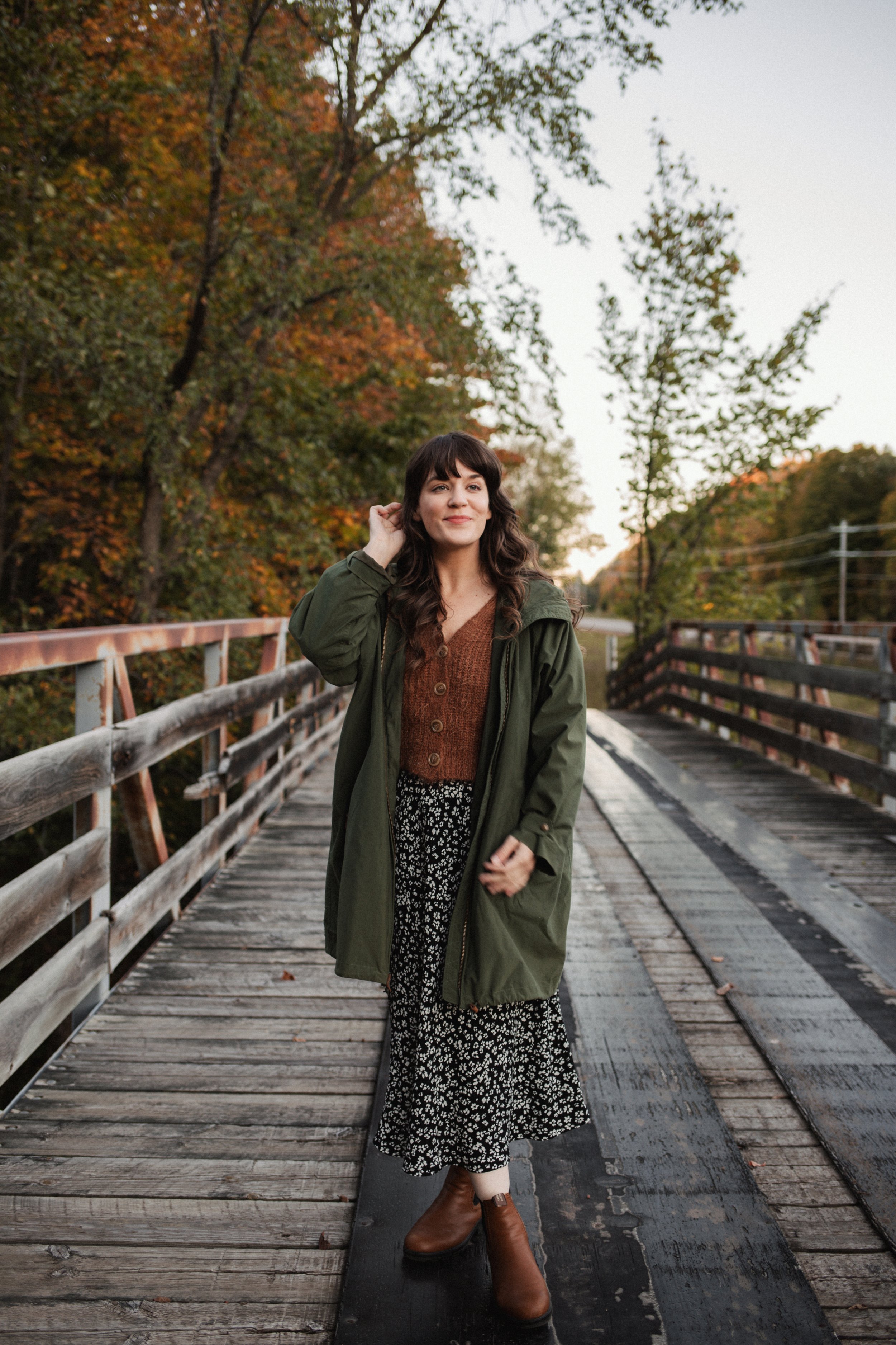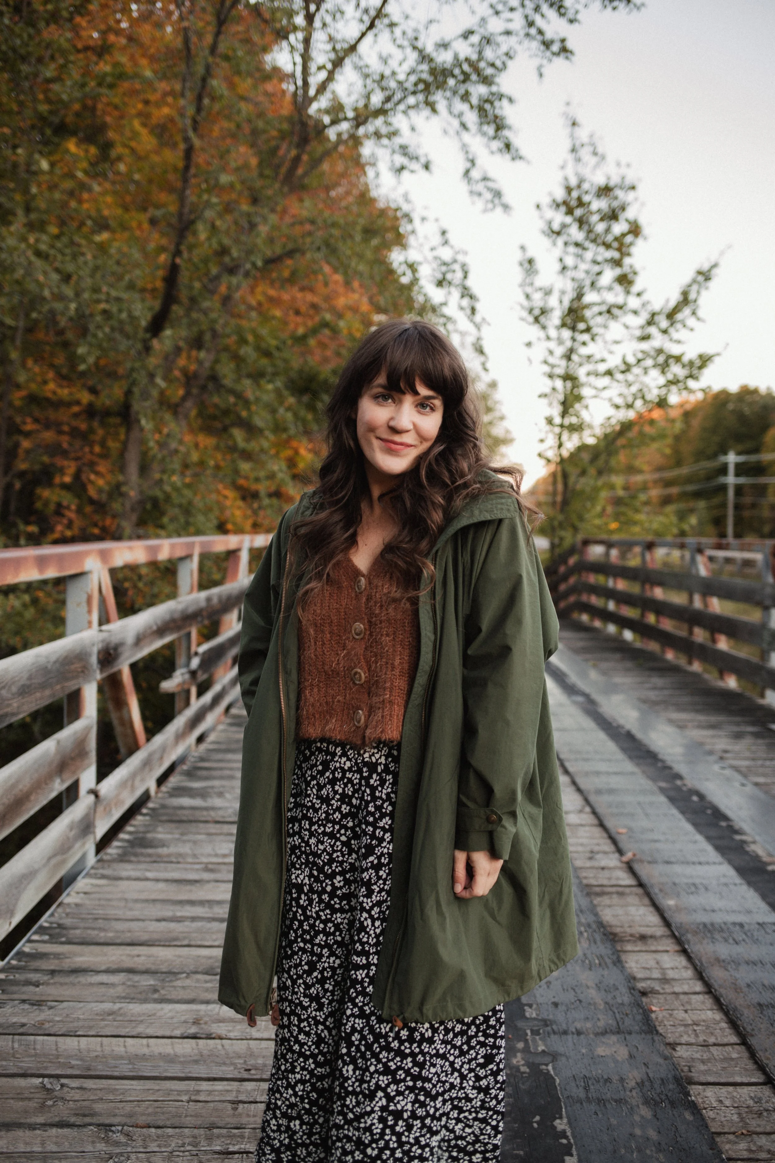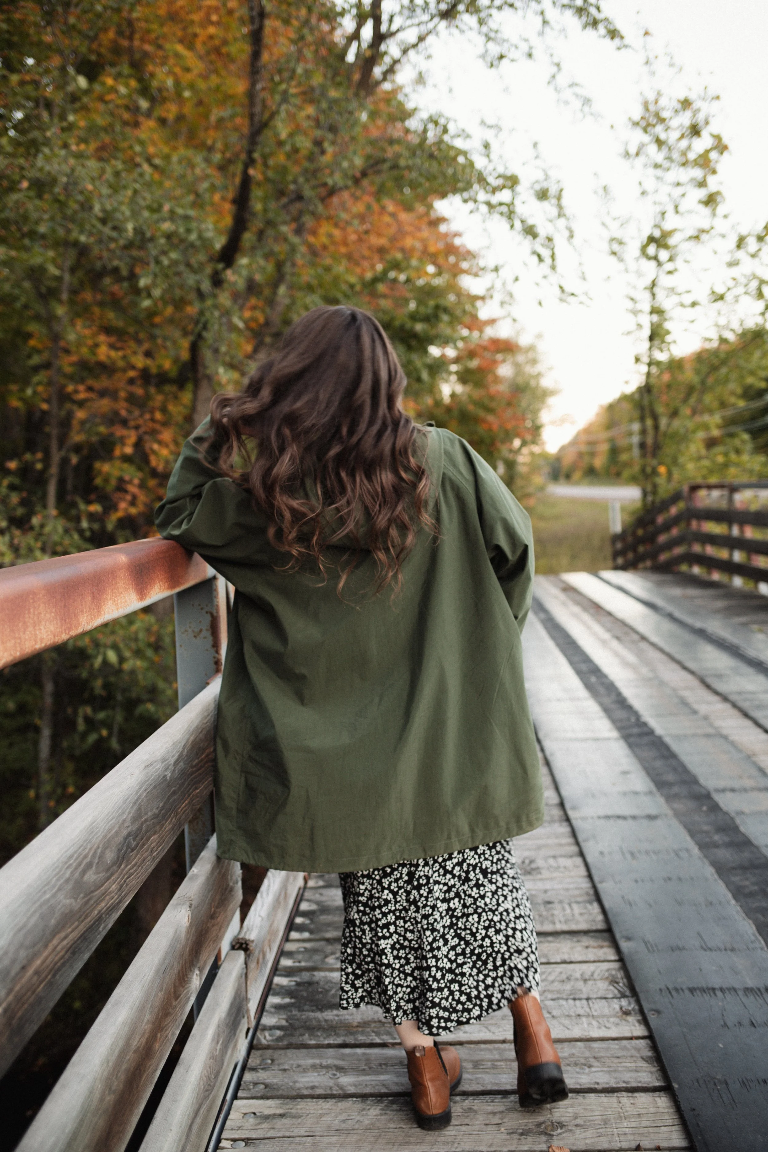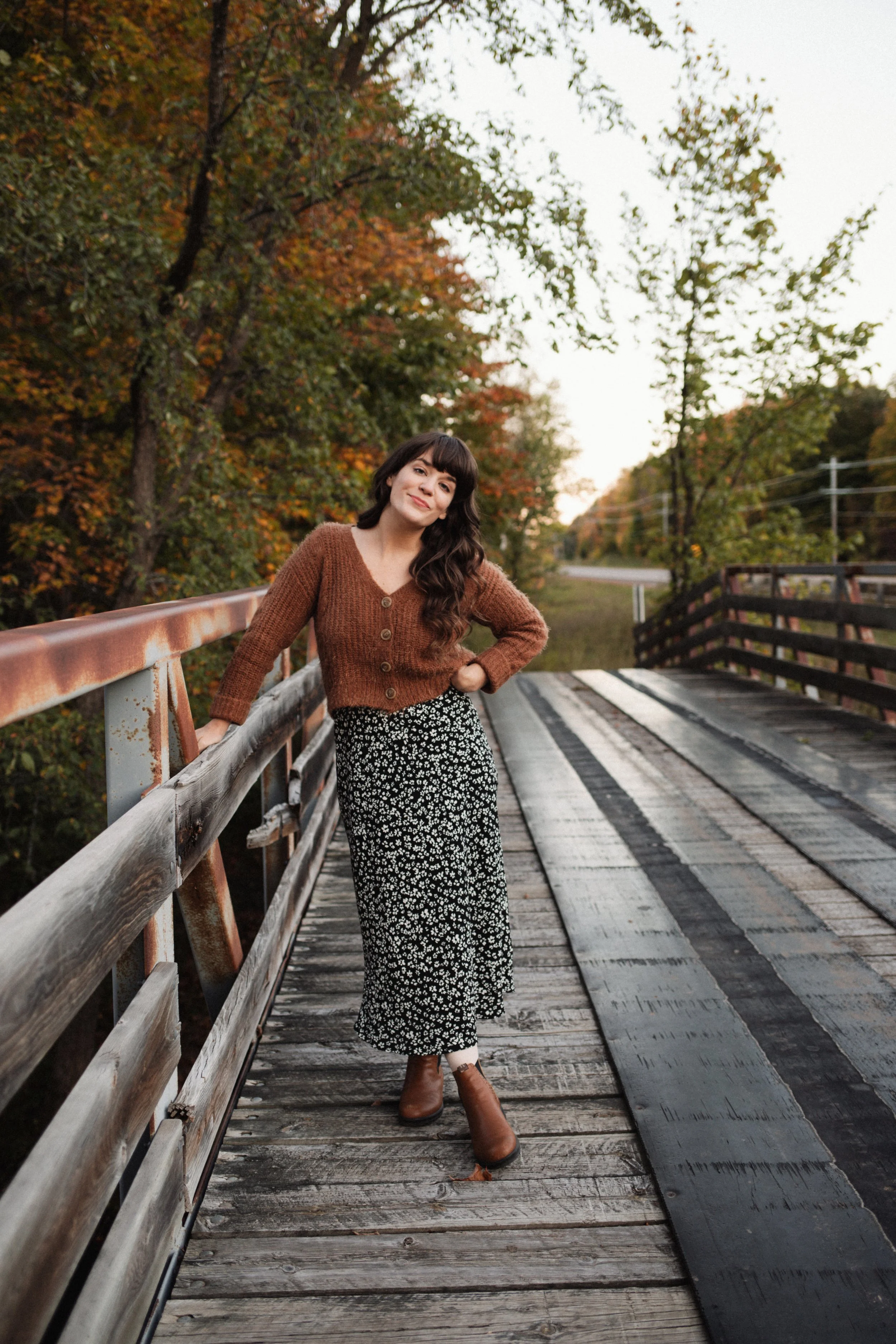 Living in the Upper Peninsula for five years now (what!), I’m quickly becoming a location repeater, just because… I have my favorite spots up here in different seasons now! This bridge, well not even technically a bridge, but it’s a snowmobile bridge over the Yellow Dog River near Big Bay, but it’s just a vibeeeee! I always like how my photos turn out here. Plus, I honestly love tradition… and routines, it’s grounding? Like something to look forward to every year? Also takes some guesswork out of where to take photos? I don’t know. But I ventured out here quickly on a weeknight, was racing to make sure I hit that golden hour light, and wore a little bit different of an outfit! We finally have some chillier temperatures up here, so I can layer, and I just love autumn style and colors. It’s the best.
