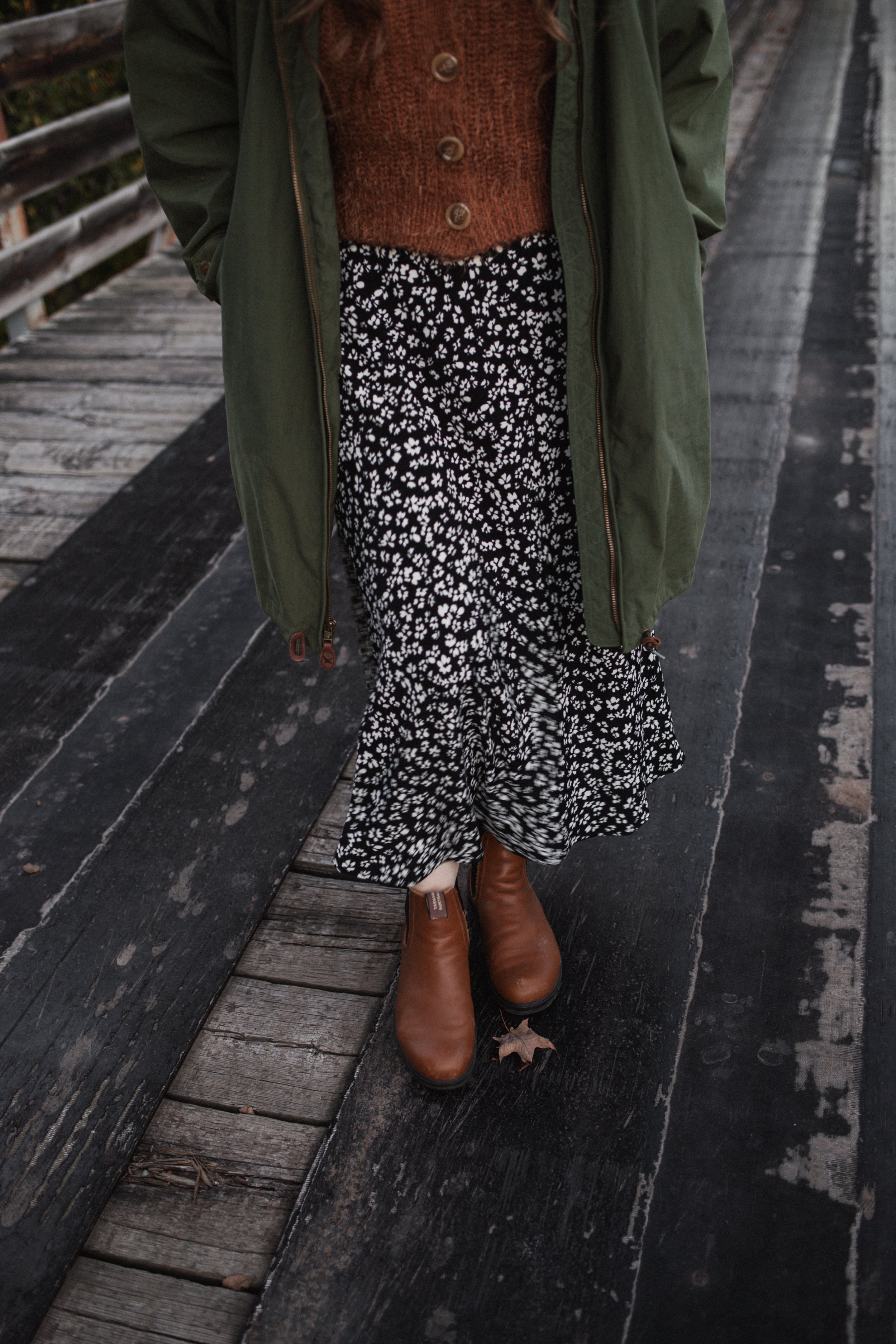 I picked up this skirt from a local boutique in Marquette, but I actually was able to link to an exact product this time from another boutique, lol. (So rare these days.) And it’s on sale for less than $20! But I thrifted this coat last winter from a shop in Houghton, and have had this cardigan for quite a few years now. I haven’t done any shopping this fall, which is kind of nice, just repurposing some things I bought this summer into fall, and relying on some old favorite staples! It’s always fun to see how far a few key layers can stretch your wardrobe — a cardigan or coat can completely change the vibe of a piece you wore all summer.