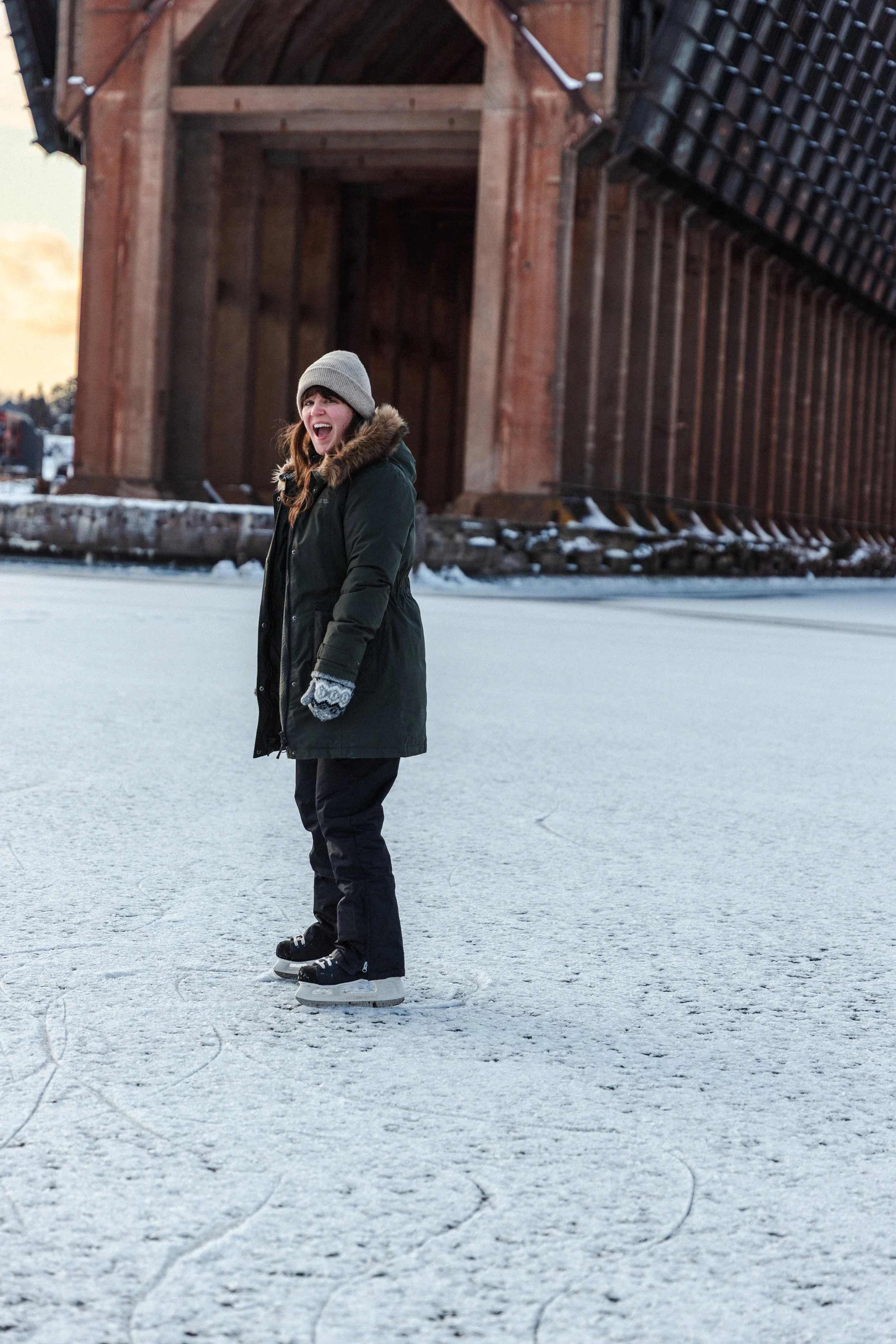 I always love an ice-skating moment at the Ore Dock when Lake Superior freezes over! My first time experiencing this was when I first moved to the Upper Peninsula, the winter of 2021, and it was one of my top core memories… just so freaking magical. I think it’s frozen over a couple times the last few years, but conditions have been pretty ideal this year for it to happen in a way to skate. Subzero temperatures and not a lot of snow the last couple of days, which is exactly what we need! I had a friend call and tell me to keep watch (since my apartment is so close), so as soon as I saw people out there, I was like, it’s on! Thankfully Elliot had an extra pair of hockey skates I fit into… literally saved the day, so we got out there and skated around for a bit, ran into photog friends, and it was so funnnnn. ⛸️🧊